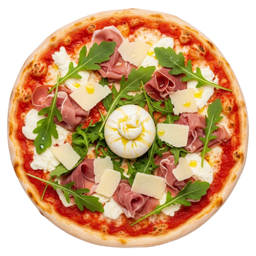 sos pomidorowy, ser mozzarella, rukola, prosciutto crudo, grana padano, oliwa