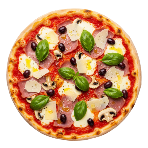 sos pomidorowy, bazylia, ser mozzarella, ser grana padano, oliwa, sól morska, gotowana szynka, oliwki, grzybki