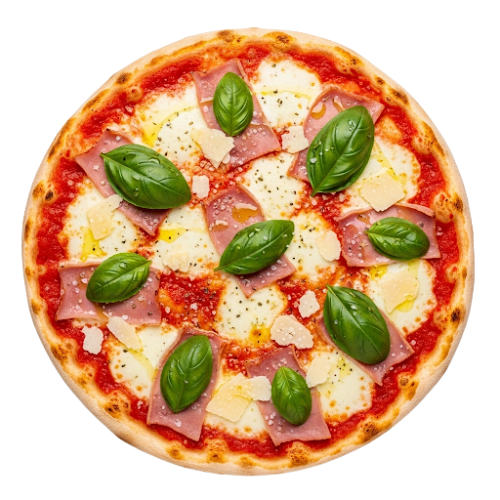 sos pomidorowy, bazylia, ser mozzarella, ser grana padano, oliwa, sól morska, szynka gotowana