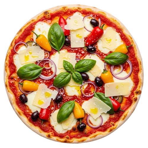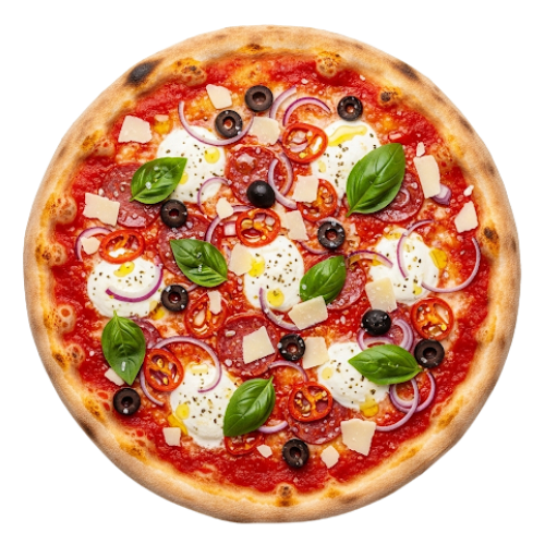 sos pomidorowy, ser mozzarella, bazylia, ser grana padano, oliwa, sól morska, mini papryczki, oliwki, czerwona cebula