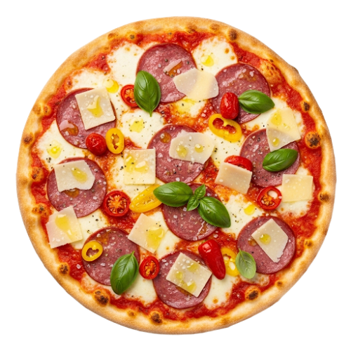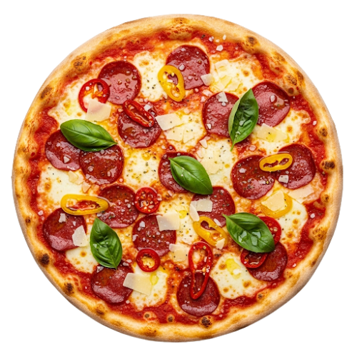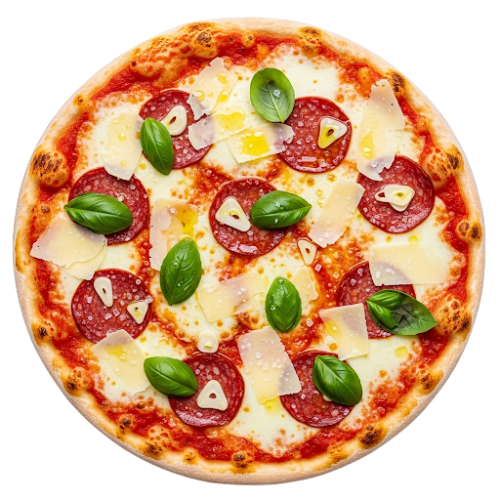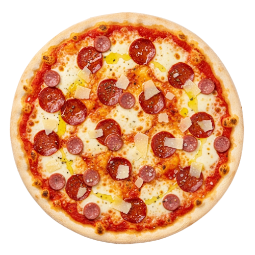 sos pomidorowy, ser mozzarella, bazylia, ser grana padano, oliwa, sól morska, salame pepperoni