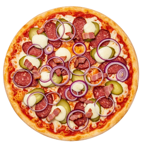 sos pomidorowy, ser mozzarella, kiełbasa, czerwona cebula, wędzona mozzarella, boczek, ogórek kiszony